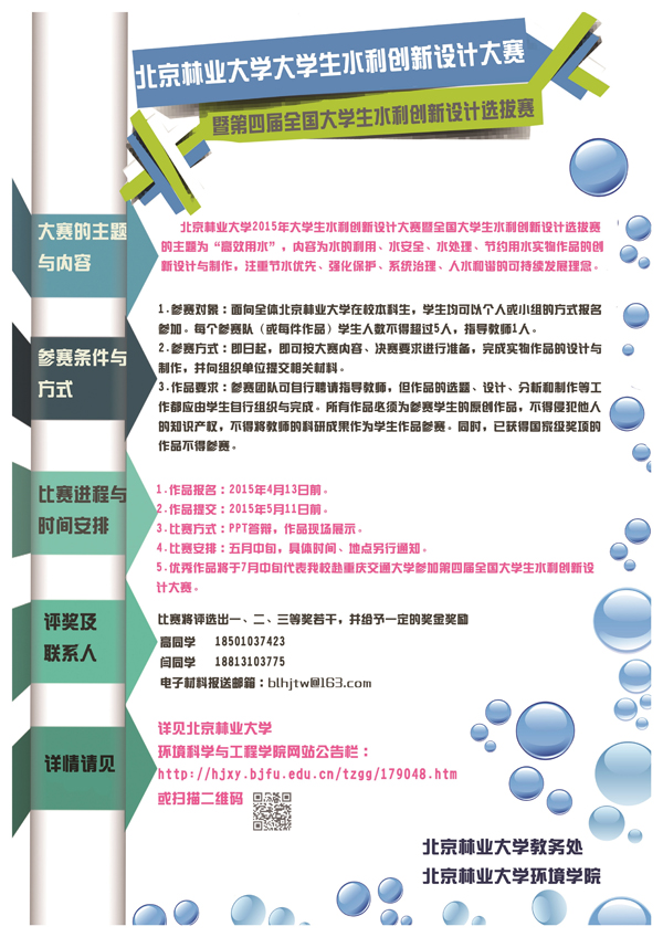 北京林业大学大学生水利创新设计大赛暨全国大学生水利创新设计选拔赛(2015年)的主题为“高效用水”,内容为水的利用、水安全、水处理、节约用水实物作品的创新设计与制作,注重节水优先、强化保护、系统治理、人水和谐的可持续发展理念。作品设计需与大赛的主题和内容相符。
