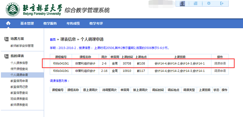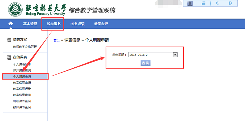 教师须登录教务系统(http://newjwxt.bjfu.edu.cn/),点击菜单“教学服务”。在该界面下,点击“个人调课申请”,选择学年学期,查询课程安排,如下图所示:
