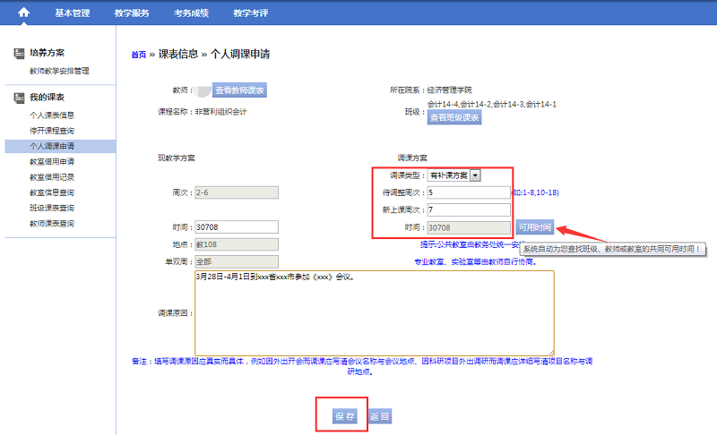 填写补课的“拟上课周次”,并选择“可用时间”,“保存”返回,确认无误后点击“送审”,等待学院和教务处审核。审核通过后即可按照新的时间、地点补课。