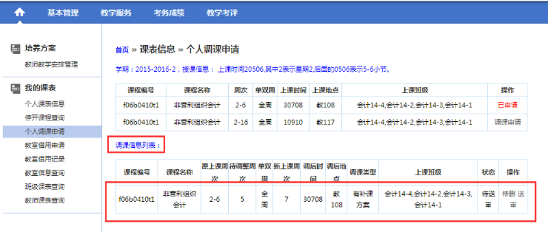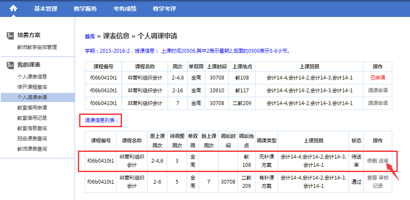 保存之后将返回上一界面,调课信息列表里将显示出刚保存的调课记录。确认调课信息无误后,点击“送审”,等待学院和教务处审核,如下图所示: