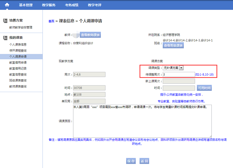 在调课类型选择“有补课方案”,并填写“待调整周次”、“新上课周次”、“时间”以及“调课原因”,如下图所示: