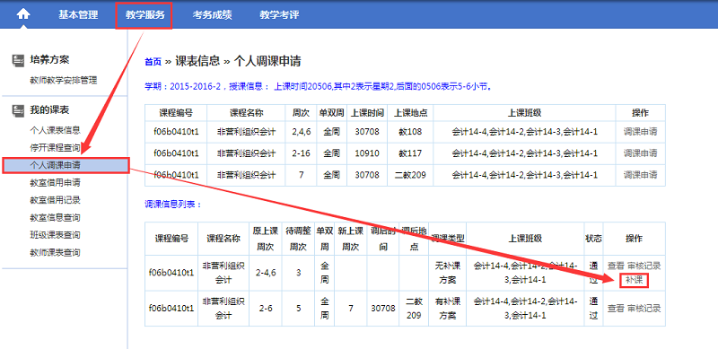 选择待调整的课程,点击“调课申请”,如下图所示: