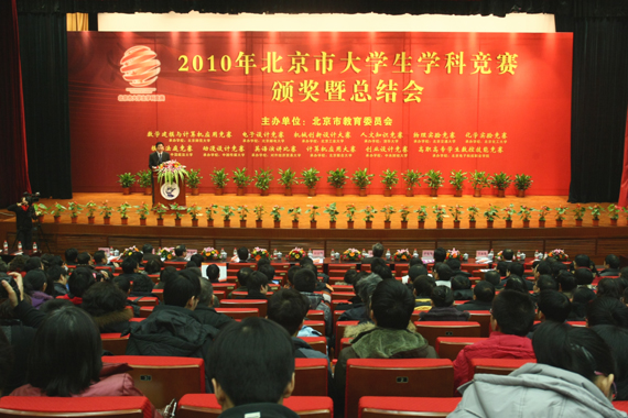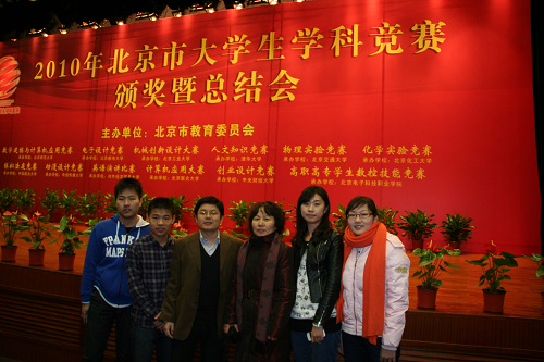 为表彰在学科竞赛中取得优异成绩的学生,扩大学科竞赛影响力,同时总结经验,推动竞赛活动的深入开展,促进教育教学改革,2011年1月7日下午,2010年北京市大学生学科竞赛颁奖暨总结会在中央财经大学学术会堂隆重举行,教育部、北京市教委领导、北京各高校代表出席了颁奖会。我校教务处相关负责人、指导教师代表以及3名获奖学生代表参加了此次会议。