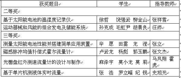 2010年11月在北京交通大学举行的2010年北京市大学生物理实验竞赛获奖结果于日前揭晓。此次竞赛,共有150组参赛队伍,我校派出的六组选手全部获奖,其中理学院电子系张祥雪老师指导电子08级徐哲组制作的“基于太阳能电池的温湿度记录仪”及电子系汪沛老师指导电子08级孙克成组制作的“运动机械和风能的组合发电及储能系统”获得二等奖。电子系张文杰老师、张立老师、马凤翔老师、霍虎老师及史旭光老师指导的其他四组获得三等奖。另外我校获得“最佳组织奖”。