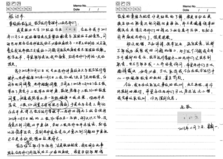 近日,某学院学生会所借教室申请单填写用途与其实际用途不符,更严重的是用来进行合唱比赛,对教学楼的教学学习氛围造成了严重的干扰,破坏了教室的管理使用规定,情节恶劣。二教管理员已将其监控录像调出,并上报教务处。与其具体负责人联系后,对其进行了教导,现将其检讨书公示如下,并对其所在学院处以本学期不予以借教室的处理决定。